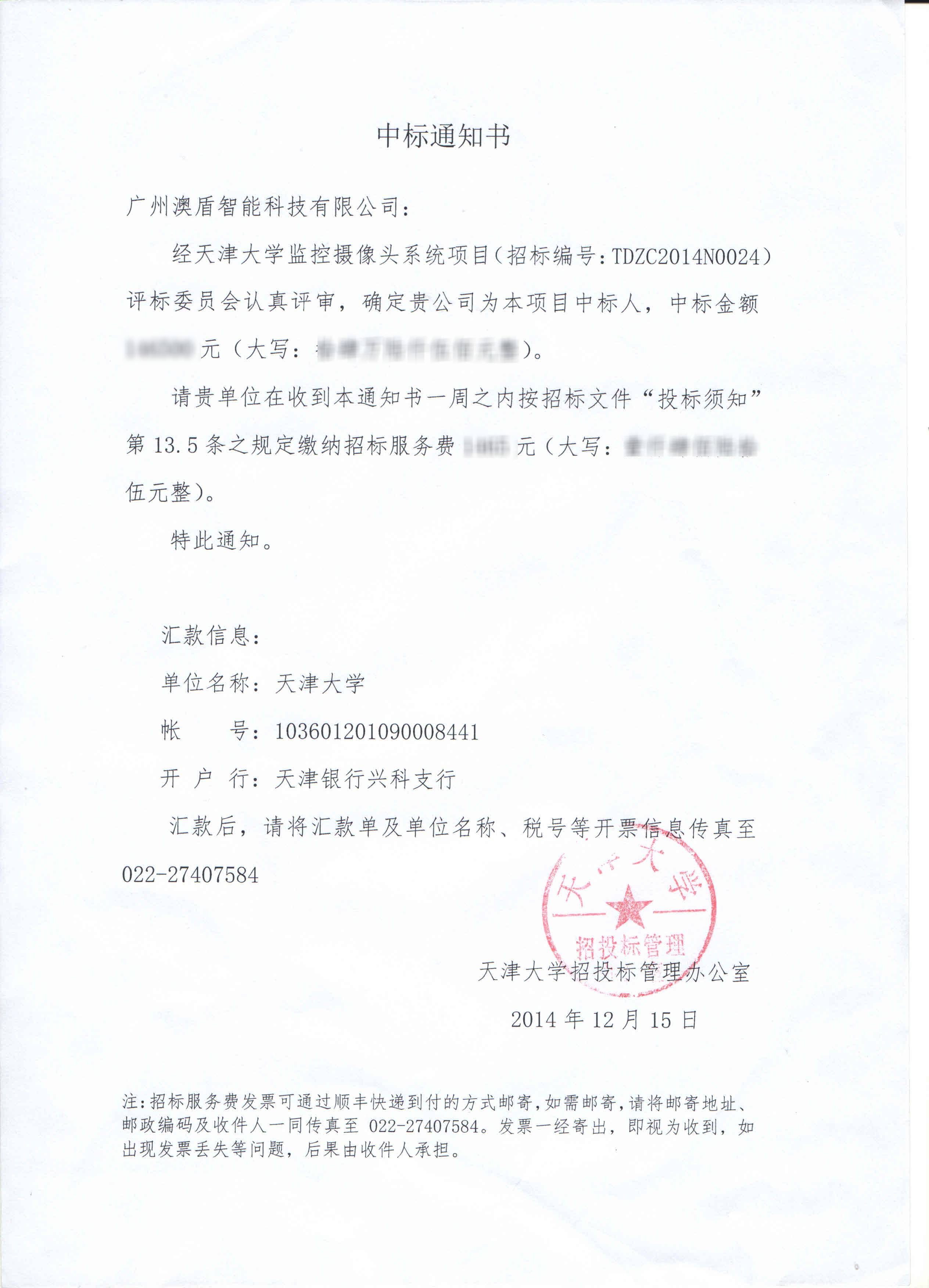 天津大學是教育部直屬國家重點大學,是中國第一所現代大學。天津大學公開招標的監控攝像頭系統項目,經過與幾家實力雄厚公司的激烈競標,我司成功獲得了該項目供貨資格。
